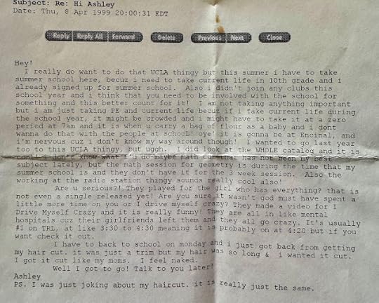 Ashley sent me a fun-reading email. It looks like she won’t participate in the UCLA High School Students summer session 1999. That’s okay. I’m sure new opportunities will come her way. Here’s her email. I like how she spoke of the NSYNC songs: