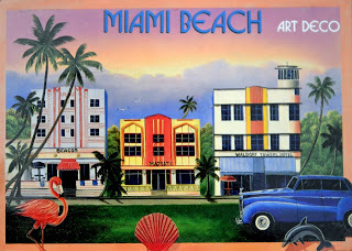 Hi! I chose this postcard to give you an idea of the ART DECO AREA in South Beach, Miami. I’m having a good time but miss you all. I’m going to good restaurants, playing Bridge, working out at the spa, going shopping, swimming, lying in the sun: “THE GOOD LIFE”.