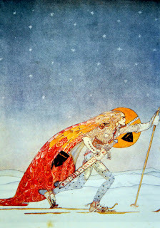 I am listening to the rain splash against my kitchen window. This card grabbed me (SO THE MAN GAVE HIM A PAIR OF SNOWSHOES, from East of the Sun West of the Moon, London 1914 by Kay Rasmus Nielsen, Danish b. 1886 d.1957). I found it when I stopped at this bookstore the other evening after viewing the film, HERO, starring Dustin Hoffman. Enjoy.Love, Barbara