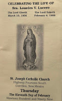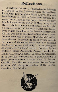 And from Cousin Edward Espinosa in Albuquerque: Did you get word of Marie-Antoinette's mother’s death (Aunt Lourdes)? The funeral was in Cerrillos, NM and it was nice to see so many Lucero’s again, but sad; particularly since there is a family feud between Gilbert (a son) and Marie-Antoinette.