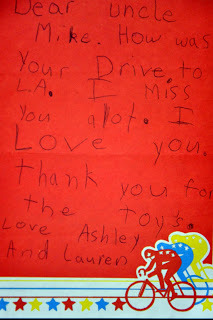 And the best of all was a note from my nieces, Lauren and Ashley (making my visit worth it). They wrote:Dear Uncle Mike,How was your drive to L.A.? I miss you a lot. I LOVE you. Thank you for the toys.Love, ASHLEY AND LAUREN