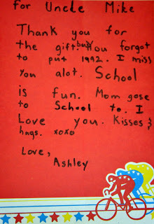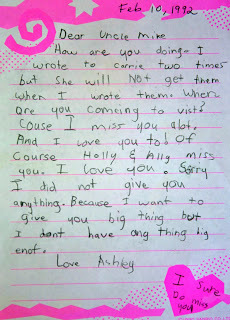 I guess my words worked over Christmas when I asked Ashley and the girls, “Will you write to me, please?”January 14, 1992For Uncle Mike,Thank you for the gift but you forgot to put 1992.I miss you a lot. School is fun. Mom goes to school, too.I Love You. Kisses and Hugs, XOXO, Love, Ashley