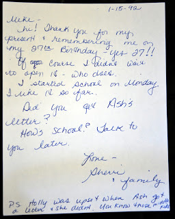 And a day later Sherri wrote, too:1-15-92Mike-Hi! Thank you for my present and remembering me on my 27th Birthday. Yes, 27!!!Of course I didn’t wait to open it. Who does?I started school on Monday. I like it so far.Did you get Ash’s letter?How’s school? Talk to you later.Love,Sherri and FamilyP.S. Holly was upset when Ash got a letter and she didn’t. You know those middle kids.