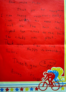 Dear Uncle Mike,Thank you for everything. I like those VALENTINE’s. Holly can write her name now.Look on the back, Holly signed her name.The candy was great.Thank you for the dollar.HAPPY VALENTINE’S DAY.Thank you, I miss you.AshleyP.S. I love you.