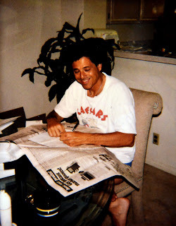 We slept to the roaring, surging sound of waves below, but next morning, under a sky colored like a pigeon’s neck, the sea was calm and reflected the sunrise.--Emily Hahn, NO HURRY TO GET HOMEOn July 2nd (1991) I took a random shot of Alan browsing the newspaper while at his apartment in Sea Colony, Santa Monica. I feel like I am spending more time there (and I like the sea breeze). Alan's divorce is agonizing to him right now as the attorney fees seem to continue to add up.