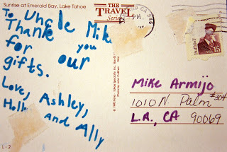 I wish I had time to get a haircut; however, it’s a good time to test the waters to see how long I can get my hair to grow. I’ve always wanted long, long hair—but never seem to reach that point. The hot summers entice me to cut all of my hair off. My hair grows so fast. My six year old niece, Ashley, sent me a postcard to thank me for the Christmas gifts I sent to her and her sisters (Holly and Ally). That was a super sweet find in my mailbox. She sent a postcard of Emerald Bay in Lake Tahoe. I assume she went there for a weekend with her parents recently.