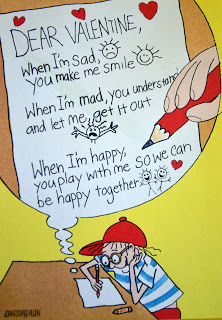 His third card was a bit on the funny side. A goober caricature was about to write at his desk and was thinking, “Dear Valentine, When I’m sad, you make me smile. When I’m mad, you understand and let me get it out. When I’m happy, you play with me so we can be happy together. “
