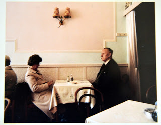 Why leave? The hotel was hidden and pleasant, so we got dressed and ate dinner there. I took a photo of Alan on one of the chairs in our room. I loved his olive green sport coat that he was wearing.