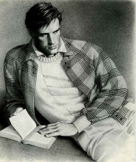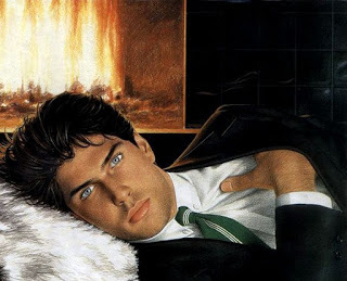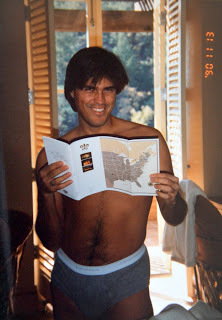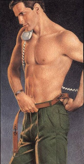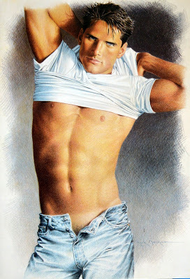 And the most fun card/letter in my mailbox this week was from Alan who was away on business in Seattle, looking after some apartment building. He made up for that last card that was so bad. This time he found a cool 1986 image sketch of a sexy guy who was pulling off his t-shirt that was artistically done by Nick Backes. Alan wrote: