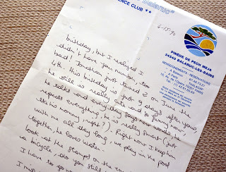 ….I was going to call you on your Birthday but I realized I didn’t have your number. Too bad! Jonathan’s birthday (JUNE) is just 9 days after yours. He still is really cute and so funny now. He talks every day and says new words. He repeats everything. He is really smart (just like his mommy, right?). Right now I keep him with me all day long. We play in the pool together. He loves water.Look at the stamps on the envelope. There is a bicycle. Do you still collect them?I have to go now…write me. I miss you.Love, Paloma