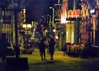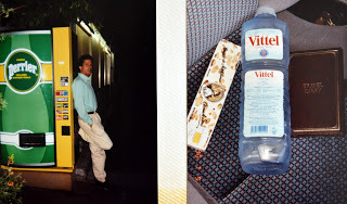 After our dinner at the LE CHOISEL and the stuffy atmosphere with the disturbing Nazi footsteps we encountered it was time for a walk. We ventured over to LE SPORTS CAFÉ. There was a German-shepherd dog lying there. For some reason I kept seeing a lot of German-shepherd dogs all over Europe. Our dinner did improve as time went on though. Perhaps we were simply feeling the effects from the wine. We hated our appetizers. I had a vegetable mousse. Alan chose duck (bacon style) with slices of melon. Who would ever hear of such a dish? It was funny listening to Alan mock the pub-type London fellow at LE SPORTS CAFÉ. I snapped Alan in front of the PERRIER vending machine and then we took a walk along the Loire River. It was such a beautiful night. Alan was right. The river depicted life. It was “calm and serene” on one side and“rough and choppy” on the other side. Life is exactly like this. Savor the 'calm and serene' moments. Don't stress out when it's "rough and choppy" as it will pass in due time.