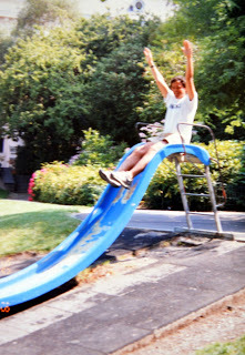 We found a playground with no children, so we decided to improvise. We got in touch with our 'child within'. I liked it when Alan obeyed me and raised his hands before he went down the slide. Alan took a photo of me next to a bike. I only wished I could ride it.