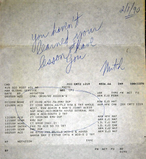 I laughed hysterically and immediately called him by phone. Mitch had included a printout from our Pac Bell Directory-Account Collection Office about payment arrangements that I had written on Dec. 18, 1989 (all in our ACO code):121889 ACO CT 1208 $4026.66/PLZ RVW & TRT WHOLE ACCT. RVW AGAIN 4 AA#’s (CANT ACCESS DAP NOW); ACO-NORTH ADVSD SERVERAL MOS. AGO 4 ACO-SOUTH 2 TRTMitch made me laugh. That phone call made me miss San Francisco and the team there. His antics and humor is THE BEST. February 2, 1990