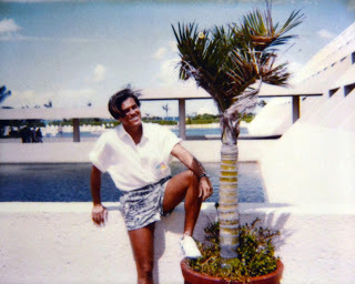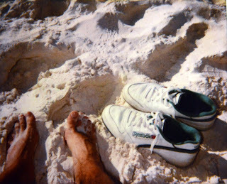 He proceeded to photograph me on the balcony in my “underpants”. Foolishly, I allowed it but I knew it was a sole Polaroid that no one would ever see (?). There are little things that happened in Cancun that seem too small to mention but I actually educated Alan on grooming. He had never used mousse for his hair before. I groomed his hair with it and took a photo of him holding the can of mousse as if a commercial TV print ad.The beach was so white sandy. I loved the feel of it in my toes. I took a photo of my feet next to my Reebok tennis shoes.