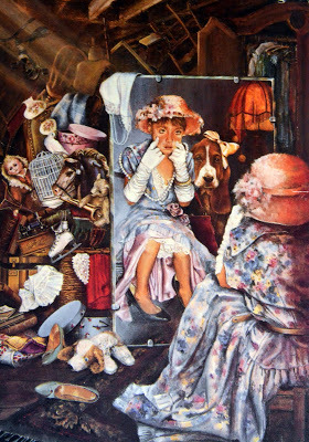 Alan introduced me to a new artist. I didn’t meet the artist. I simply took an immediate liking to her work. It seems Alan had her father as a client when he was selling municipal bonds at Kidder-Peabody. The clients’ name is Perry Preusch who lives in the Pasadena area. His daughter (the artist) is named Lori Preusch. Perry had given Alan a number of her greeting cards and Alan gave me one of her original masterpiece photo cards. It depicted a young girl, playing dress-up in an attic. I loved it as it reminded me of my nieces, Ashley Armijo or Lauren Armijo (playing dress-up). I had to send it to my mom: