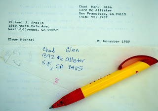 To my surprise…I received a typewritten (not very personal if it’s not handwritten) letter from an old flame I’d met at my gym in San Leandro, CA…Chad Mark Glen. I suppose I spurned it on when I mailed him a postcard. One just never knows who will reply and who will not…Chad Mark Glen1372 McAllisterSan Francisco, CA 94115(415) 921-1967