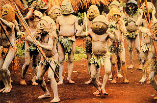 I bought this card because I got a kick out of it. I mean PARTY TIME IS PARTY TIME everywhere in the world! Can you imagine how wild this bunch gets on New Year’s Eve? I had the TV on two days ago and would you believe they were showing the ASARO MUD MEN of New Guinea! The same tribe in the same masks and everything! First thing I said was, “I know those guys!” Maybe they’ll invite us to their next party? As long as we’re not ‘dinner’. Love, Dorothy