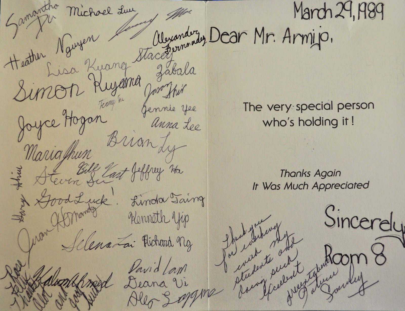 Inside the card it followed with ‘The very special person who’s holding it!’ It was signed by all of the students: Samantha Du, Michael Luu, Heather Nguyen, Jenny Mac, Lisa Kuang, Alexander Fernandez, Stacey Zabala, Simon Kiyama, Terry Fu, Jason Shiu, Jennie Yee, Anna Lee, Joyce Hogan, Brian Ly, Maria Jhun, Jeffrey Ha, Bill Kast, Linda Taing, Steven Su, Gary Shiu, Kenneth Yip, Richard Ng, Selena Lai, David Lam, Deana Vi, Rose Felix, Juan Hernandez, Alex Lagne. A part of me wants to teach again…it is so rewarding. Sometimes I am afraid as to what happens next. I shouldn’t be. I should move forward with ambition, excitement and hopeful adventure.