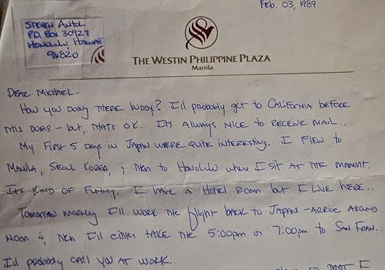 In the letter dated February 3, 1989, Steven wrote:Dear Michael,How you doing there buddy? I’ll probably get to California before this does—but that’s ok. It’s always nice to receive mail. My first 5 days in Japan were quite interesting. I flew to Manila, Seoul, Korea and then to Honolulu where I sit at the moment. It’s kind of funny. I have a hotel room but I live here…
