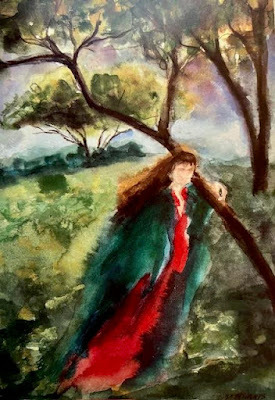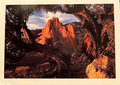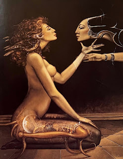While we were in Las Vegas we went to visit my former co-worker, Reed, and his wife, Deanna. By the time I got home I found a note and a cool card from him. It depicted a woman looking at a mask while a mysterious hand was trying to grab her away. It's actually an image from an oil painting on wood by MICHAEL PARKES, done in 1984 and titled: THE PALMIST. Reed wrote: