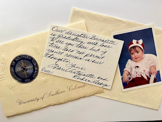 Sweet, former co-worker, Gloria Romero, finally retired after an astonishing 40 years at the phone company. She sent me a Thank You note: ‘For your love and friendship and gifts, a day I will treasure, my 40-year retirement party. Love, Gloria Romero’. I liked that she included a small photo of herself, too.