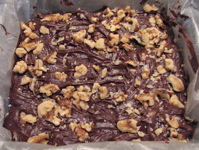 Quickly transfer contents of pan to the glass square. Top with remaining half cup of chopped walnuts. Sprinkle with a pinch of sea salt.