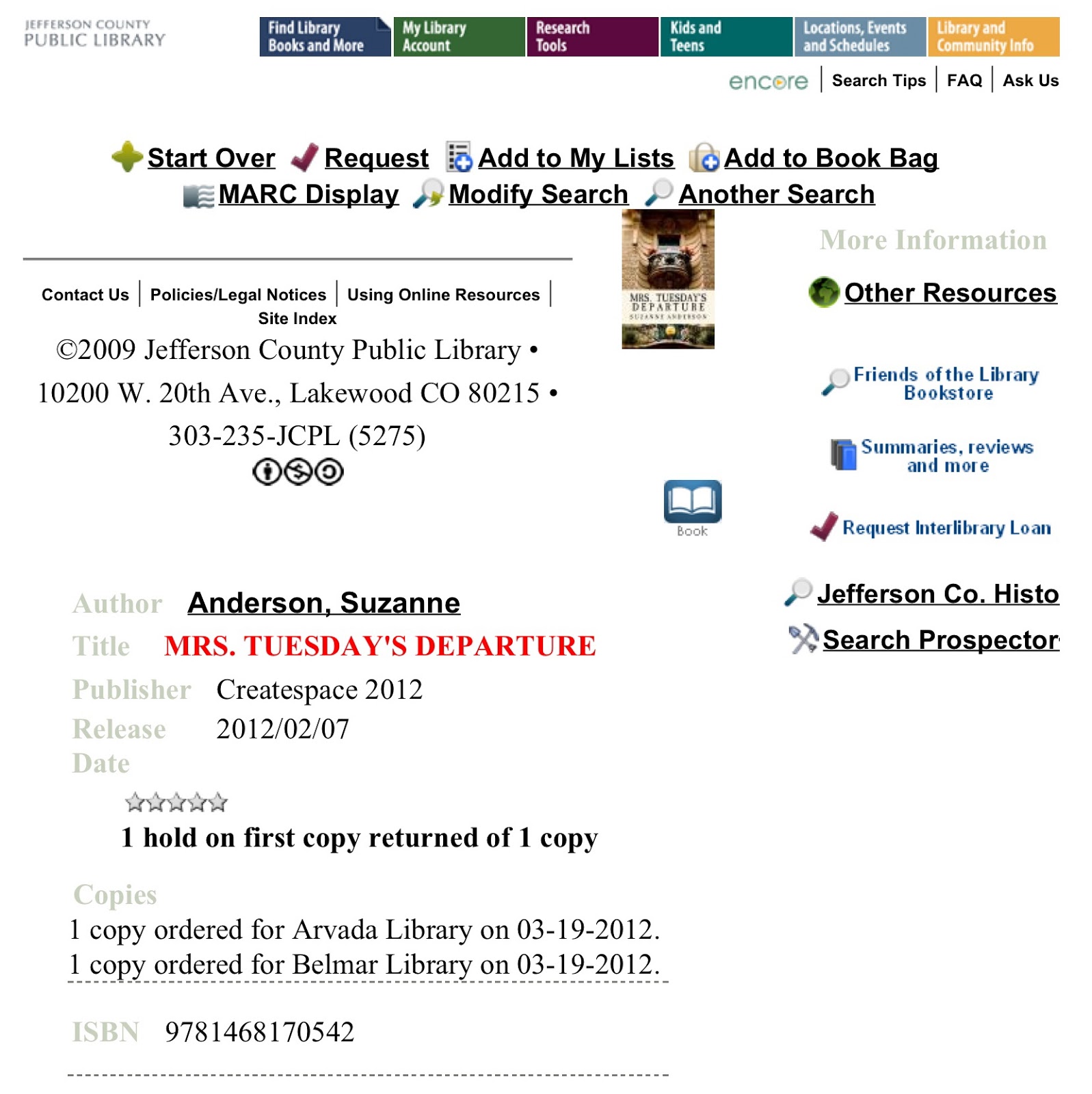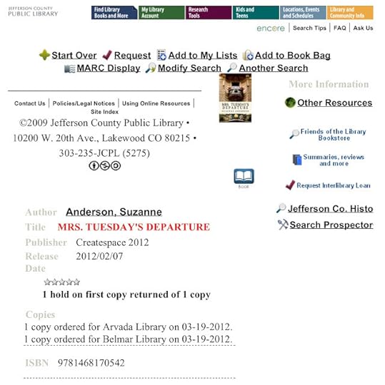 Mrs. Tuesday's Departure can now be checked out from the Jefferson County Public Library! This is a screen shot of the library's online catalogue. And that is a catalogue listing for my book.