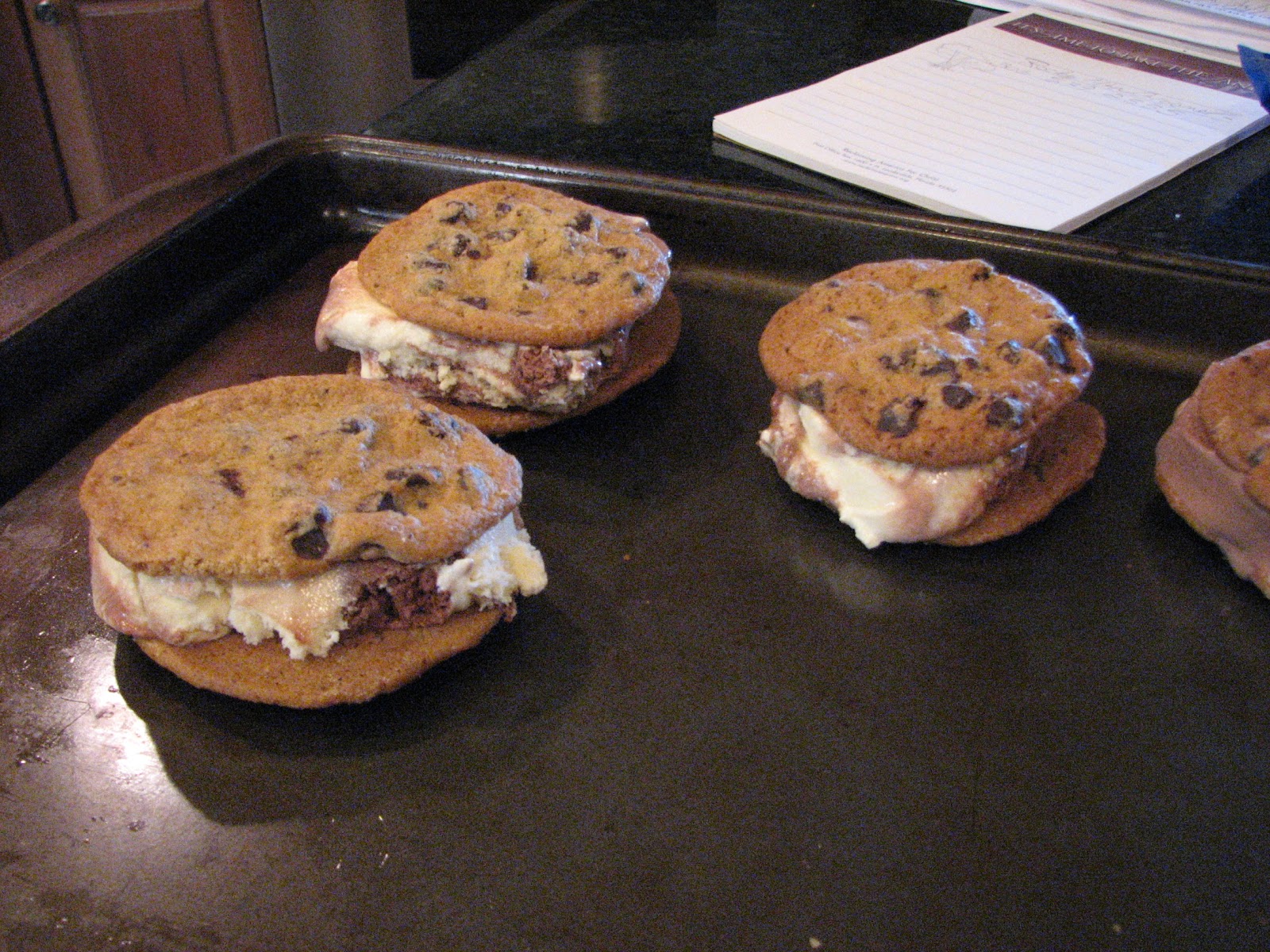 I created a little assembly area. Place a scoop of ice cream on the inside of one cookie. Then put the tops on them to create a chocolate chip cookie ice cream sandwich.