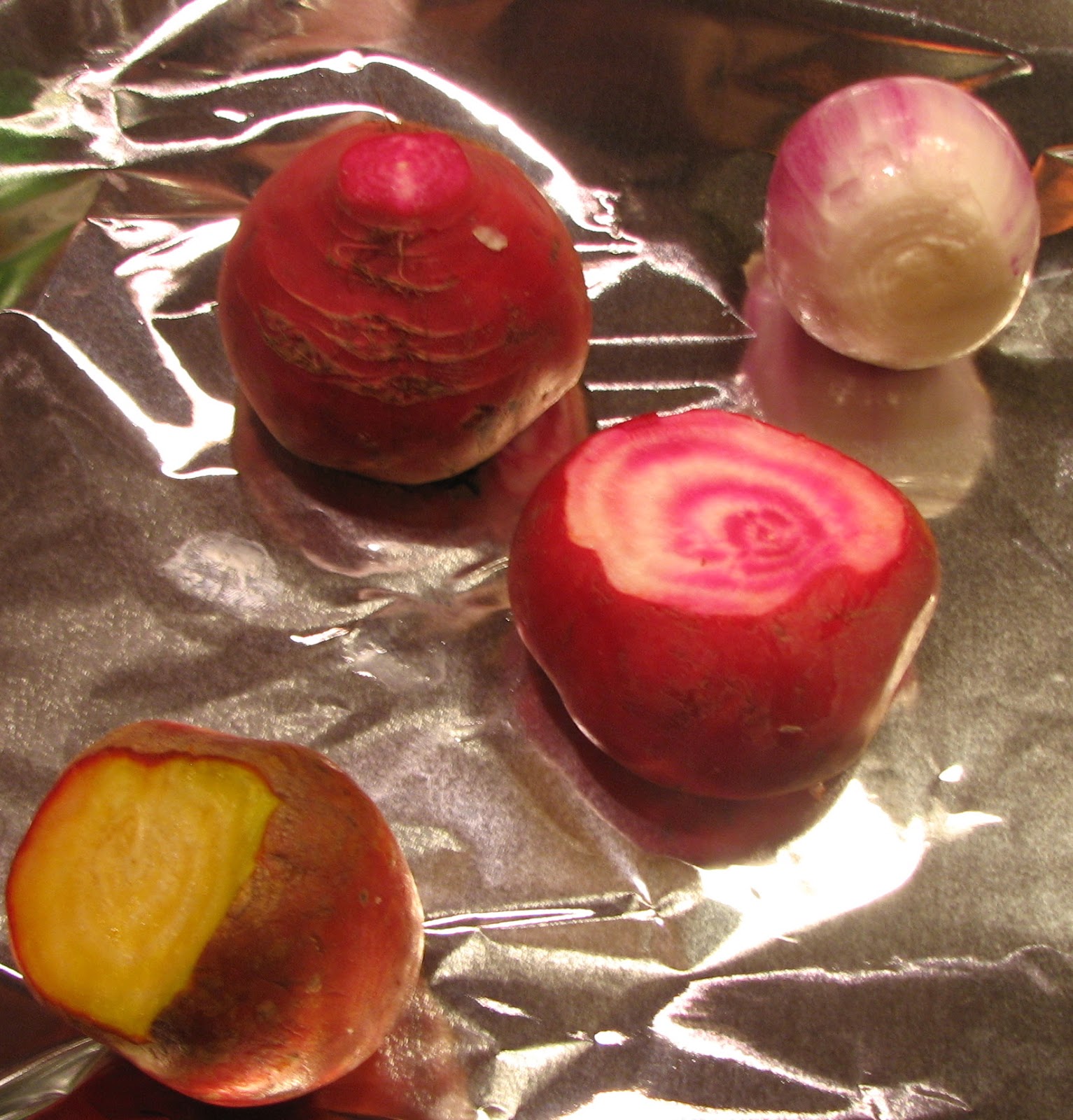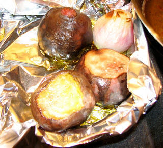 Here are my beautiful beets when they came from the oven. The picture doesn't do them justice, but they're a brownish red and look good enough to eat right then. You'll also notice I roasted an onion in the same batch.