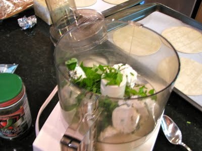 First, I blended goat cheese, fresh basil and parsley from my flower box garden, a small handful of pickled jalapenos.