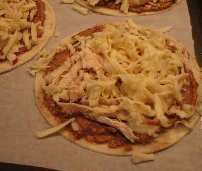 And some shredded jalapeno jack cheese. I then placed another tortilla on top and baked them in a 400 F oven for ten minutes, or until the cheese was melted.