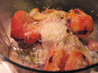 I threw the roasted beets into a food processor with the roasted onion, freshly grated parmesan cheese and olive oil. Pulse until the beets resemble roughly mashed potatoes.