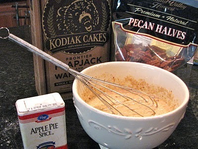 I had a flapjack box mix made with whole grains, low in sugar, called Kodiak Cakes. Excellent product. I decided to ramp up both the flavor and nutrition levels by adding a teaspoon of Apple Pie Spice and a half cup of chopped pecans (high in protein and good fats).