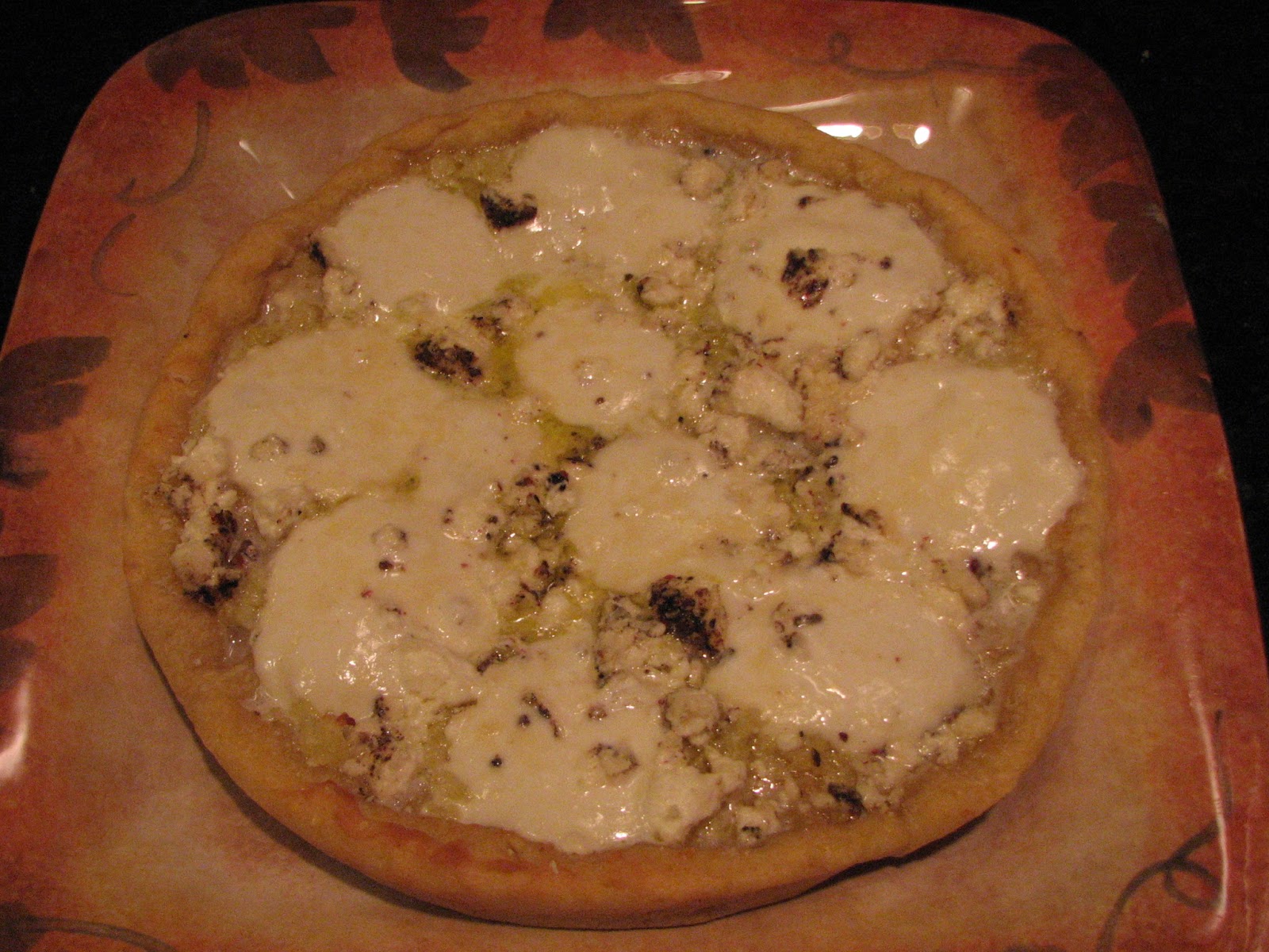 I started with a low-gluten corn meal pizza crust. I sauteed minced garlic in olive oil and a bit of butter until it was fragrant. I poured the garlic/oil mixture onto the crust of the pizza, then topped it with slices of fresh mozzarella, goat cheese, and parmigiano reggiano. Then I popped the pizza into a 400 F oven until the cheese had melted and the crust was golden.
