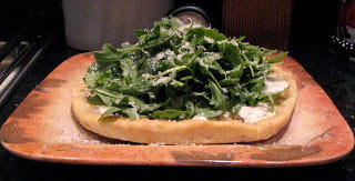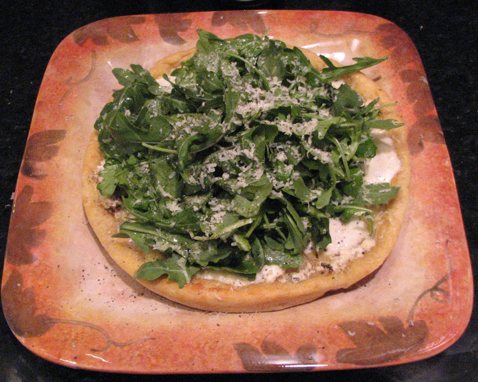 When the pizza came out of the oven, I piled the arugula salad on top of the pizza and ate both together. The strong flavors of the arugula are perfectly complimented by the richness of the assorted melted cheeses.