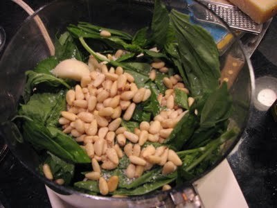 In Essentials, Ms. Hazan generously presents the pesto recipe using two different methods: 1) using a mortar and pestle, or for those without, 2) with a food processor. While I used a food processor, I hope someday to own a nice heavy marble mortar and wooden pestle, so that I can appreciate the 'authentic' pesto.