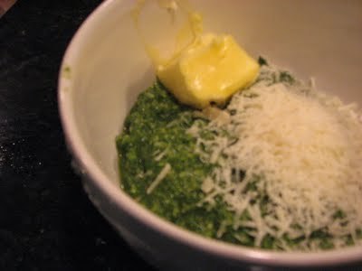Ms. Hazan instructs us to scoop the basil paste into a bowl and incorporate 1/2 cup of freshly grated parmigiano-reggiano and two tablespoons of romano cheese into the pesto. And then, two - three tablespoons of room temperature butter. BUTTER!!!!!!!!