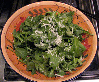 While the pizza was in the oven, I tossed a generous handful of arugula with a vinagrette made of olive oil, fresh squeezed lemon juice, and pepper. I dusted it with a few shavings of parmigiano reggiano.