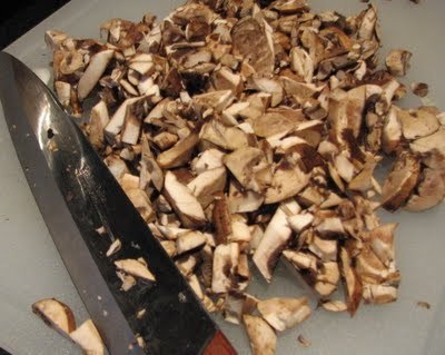 Chopped baby 'bella mushrooms are sauteed in olive oil with your choice of fresh herbs ( I had thyme, oregano, and basil on hand) and salt and pepper to taste. You can also throw in spinach or another green if you want to add more depth and flavor.