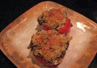 Meanwhile, cut the tops off of your medium sized tomatoes and gently scoop out the insides with a spoon, careful not to puncture the sides. You want to create little bowls to hold the mushroom mixture that you've lightly sauteed. Then top the stuffed tomatoes with bread crumbs and shredded cheese.