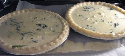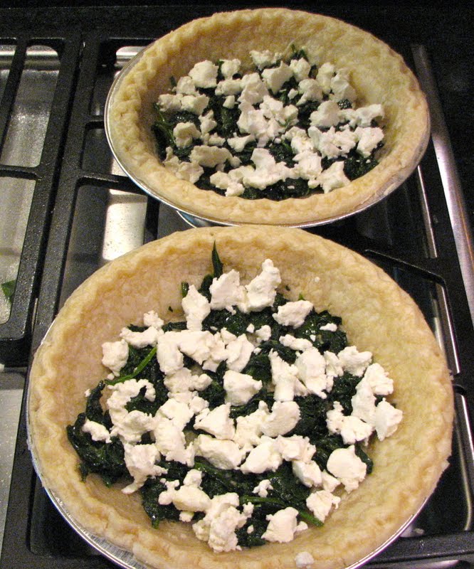 Scatter spinach in bottom of pie shell, crumble remaining goat cheese on top. Pour egg mixture over top.