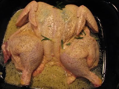 By the way, you can either butterfly the chicken at home by removing the backbone or you can have your butcher take care of it.