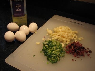 Assemble ingredients: eggs, half and half, bacon, cheese, and green onions.