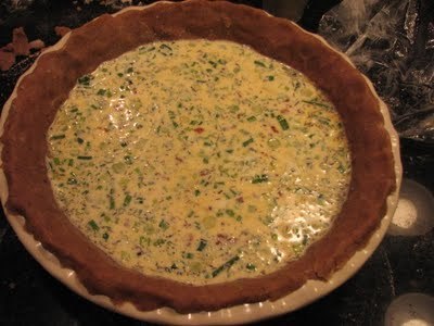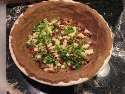 Put the cheese, bacon, and green onions in the bottom of the pie crust.