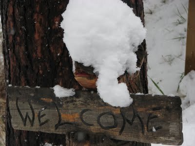 Mr. Bear steadfastly holds his 'welcome' sign despite the indignity of a snow covered head.