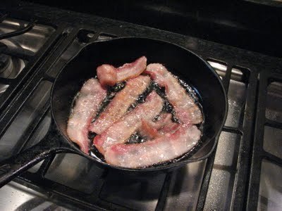 Frying bacon with a dog whose head comes up over the counter means that you will have an avid audience.