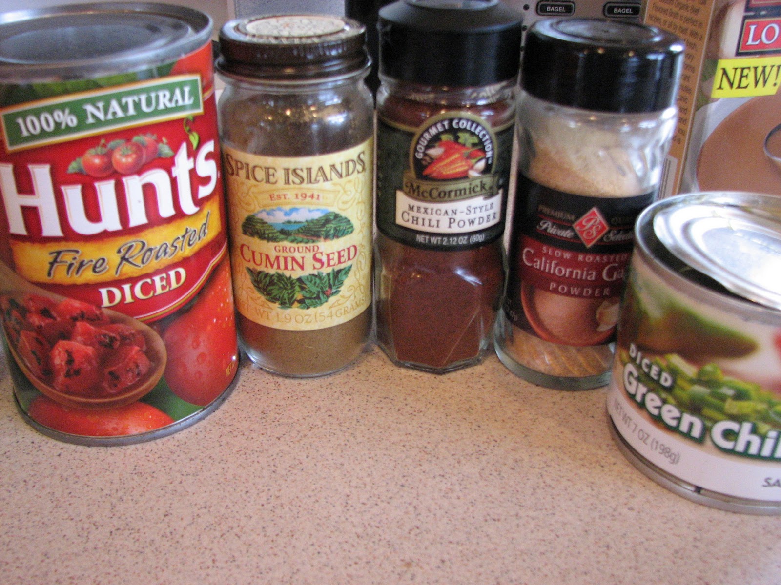 Next up was the addition of the spices you see in the background: cumin seed, chili powder, garlic powder, a pinch of sea salt, and ground black pepper. We also added a couple cans of fire roasted diced tomatoes. I like the fire roasted taste, perfect for chili.