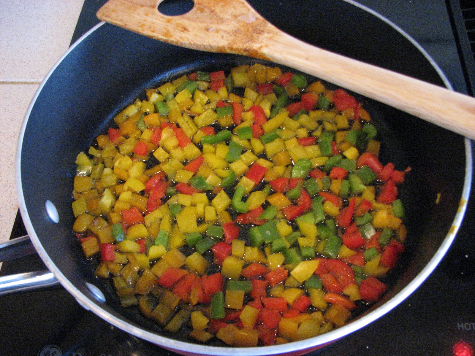 And now begins our deviation from the recipe. Mom has a thing for peppers so she diced up yellow, orange, red, and green peppers and briefly sauteed them in a separate pan and then added them to the chili.