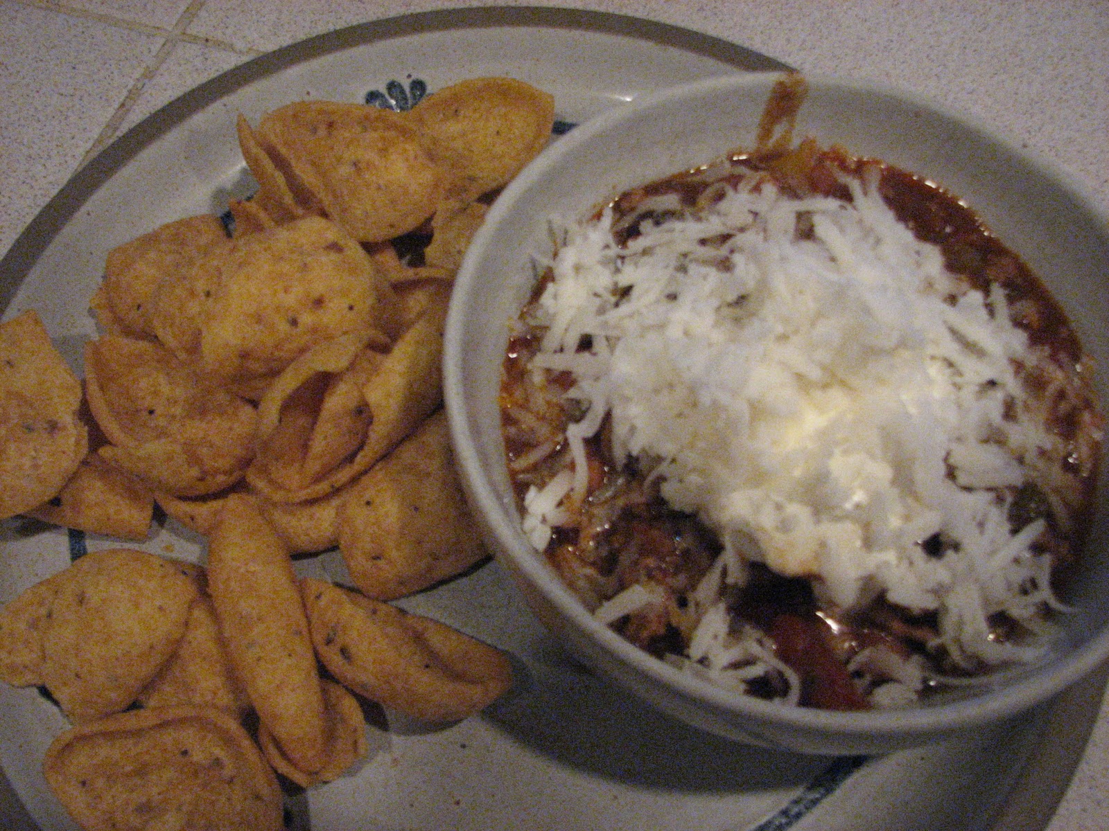 And here's what it looks like on my plate. I've added a dollop of sour cream and shredded an aged goat cheese which adds a different, but complimentary flavor than the usual cheddar. Of course, chili is not complete without Frito corn chips.