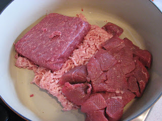 One of the reasons I wanted to try this recipe was the use of three different kinds of meat. One pound each of: ground pork, ground bison, and cubed beef. Next time, I'd keep all of the meat cubed rather than ground, I think it would add more to the flavor of the chili than the ground meat.